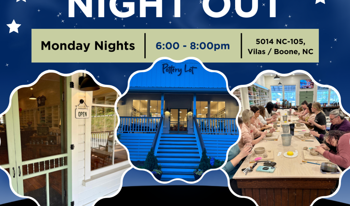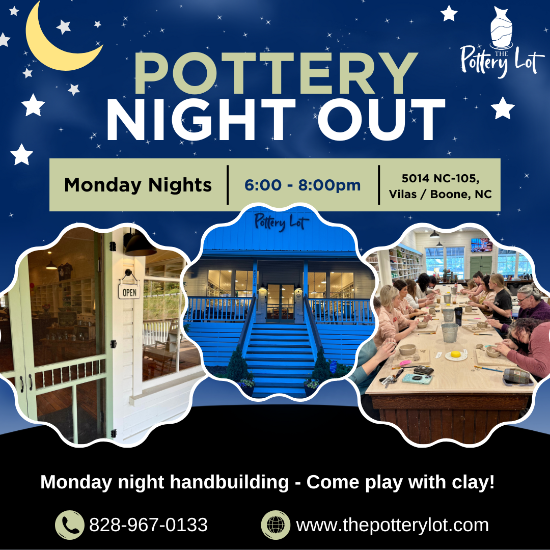 Visiting the mountains and want a creative night out? Swing by The Pottery Lot for our Monday Night Independent Handbuilding—an open-studio session with no formal instruction, perfect for curious beginners and seasoned makers alike. We’ll provide everything you need: clay, glazes, firing, and studio time. Make a mug, planter, or a little mountain keepsake at your own pace while you unwind in a friendly, community studio setting. Just passing through? No problem—finished pieces can be mailed to you after firing. Come solo, bring a friend, and get your hands in the clay!