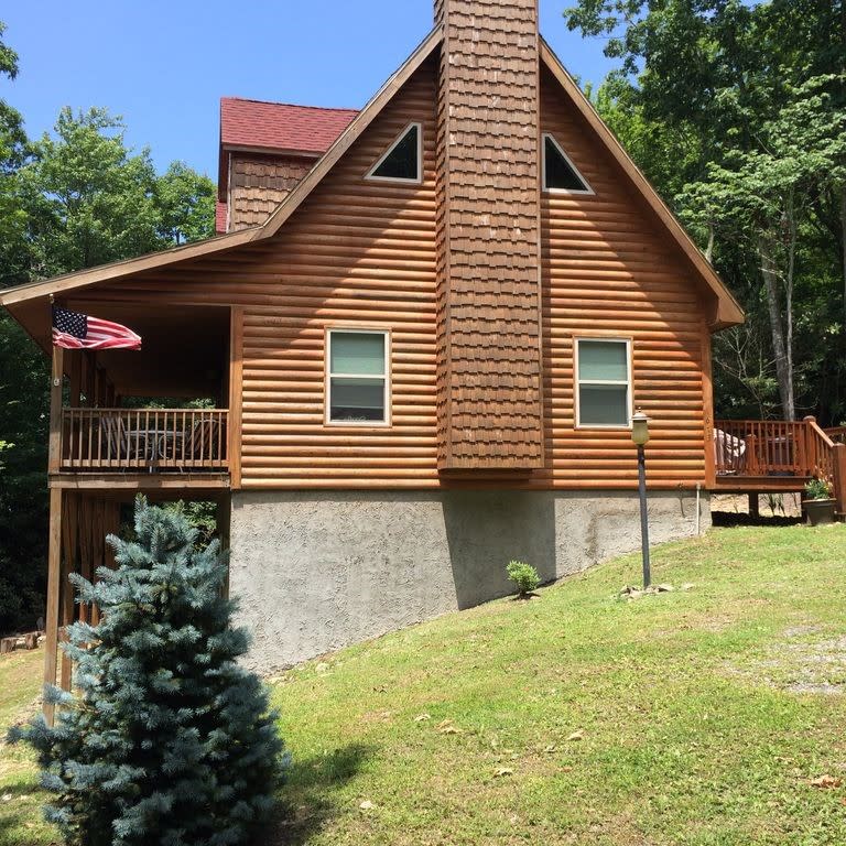 Sleeps 14. Completed in November 2009 & renovated in 2017, this energy efficient log cabin, named Mt. Sinai, is the mountaintop experience you have been awaiting. Enjoy an afternoon spent rocking on the covered porch, while overlooking rolling hills featuring cows and a red barn. This is a serene view you won’t want to leave. The house has 4 bedrooms, 3 bathrooms.